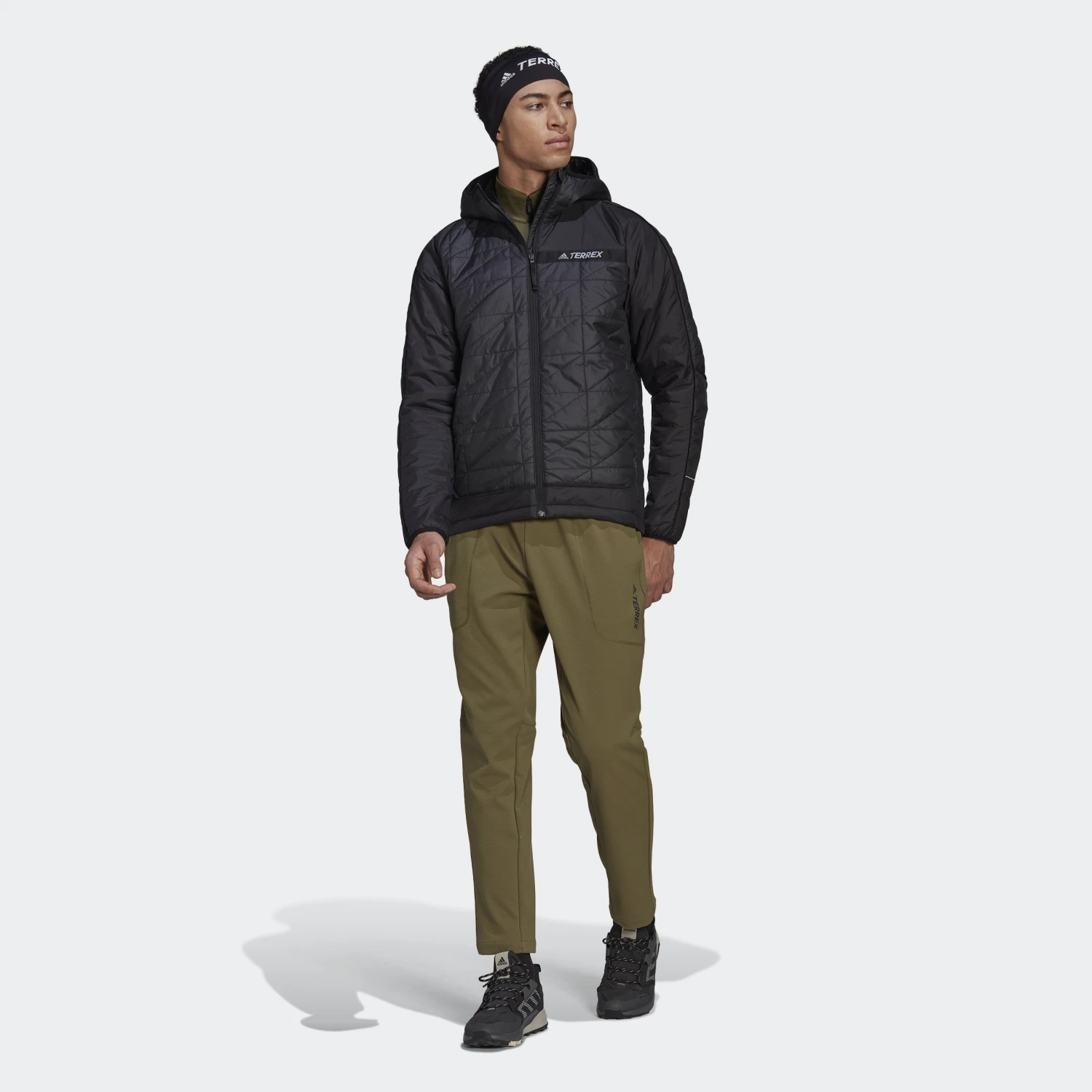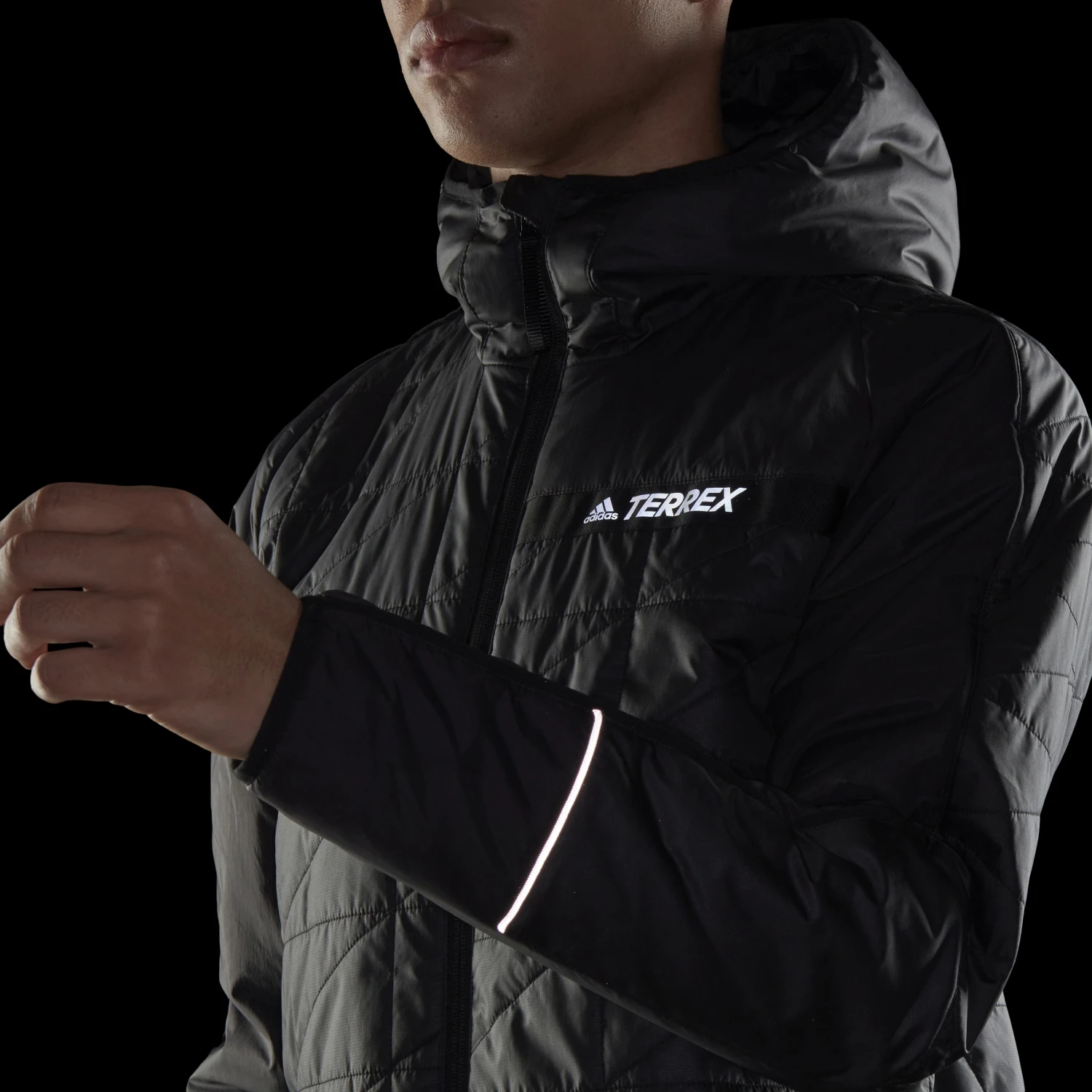 - Elastische TERREX Einfassungen an Kapuze, Bündchen und Kapuze