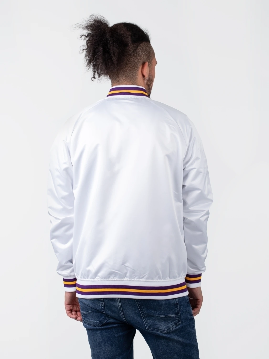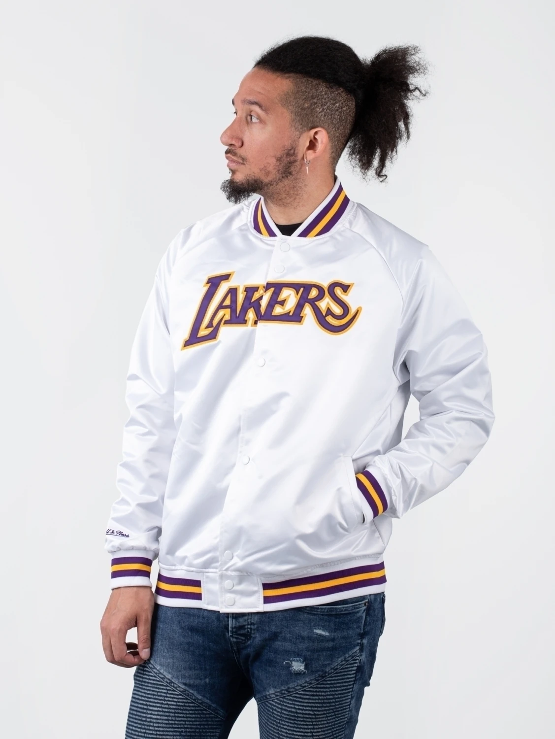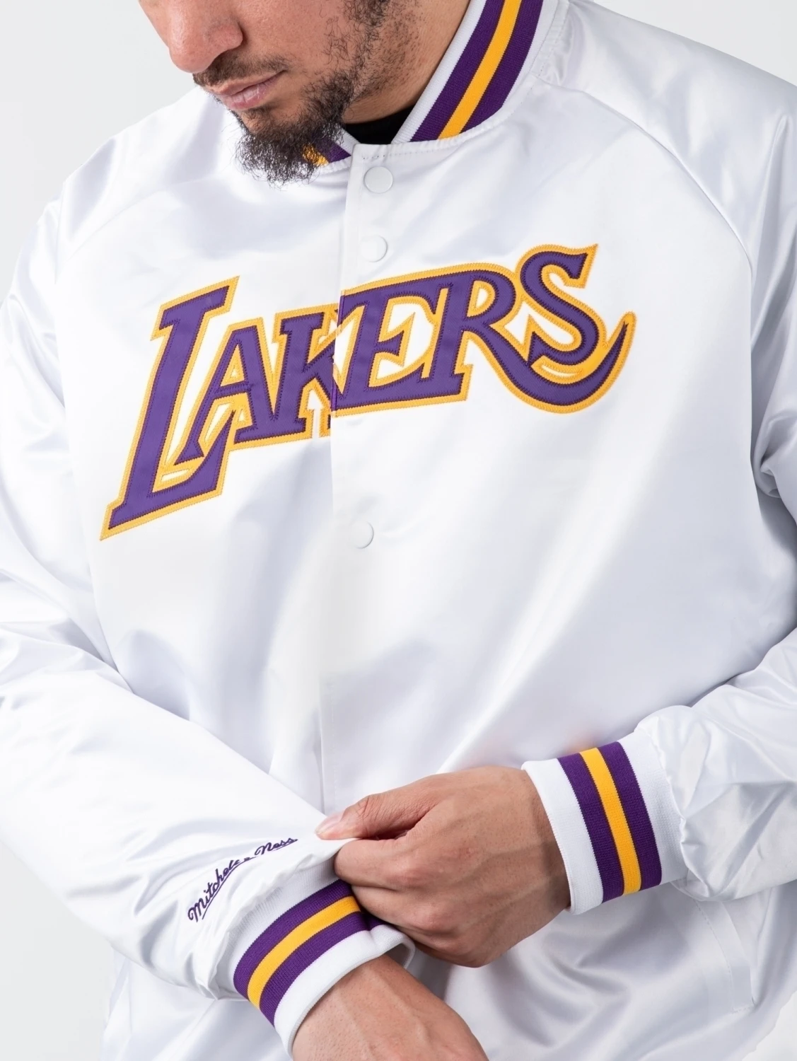 Ein fetter Team-Schriftzug mitten auf der Front und geringelte Rippstrick-Bündchen in den Farben des Vereins: Die Mitchell & Ness NBA Lightweight Satin – LA Lakers Collegejacke ist ein absolutes Must-have für alle Fans der Los Angeles Lakers!