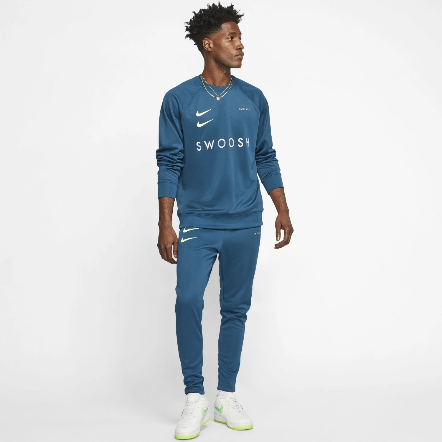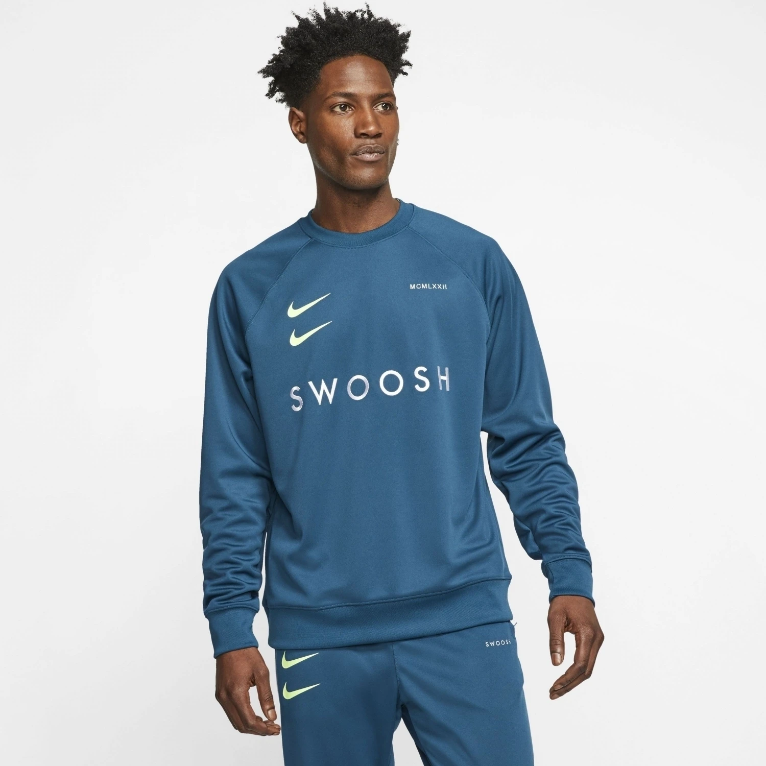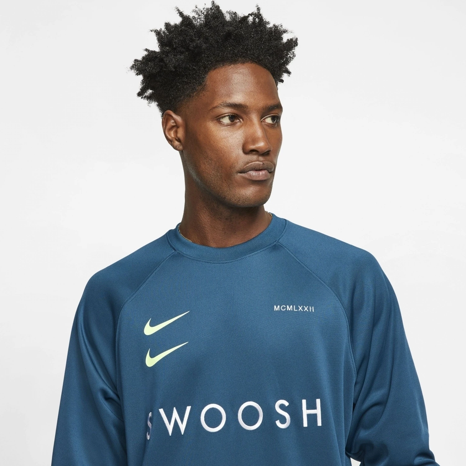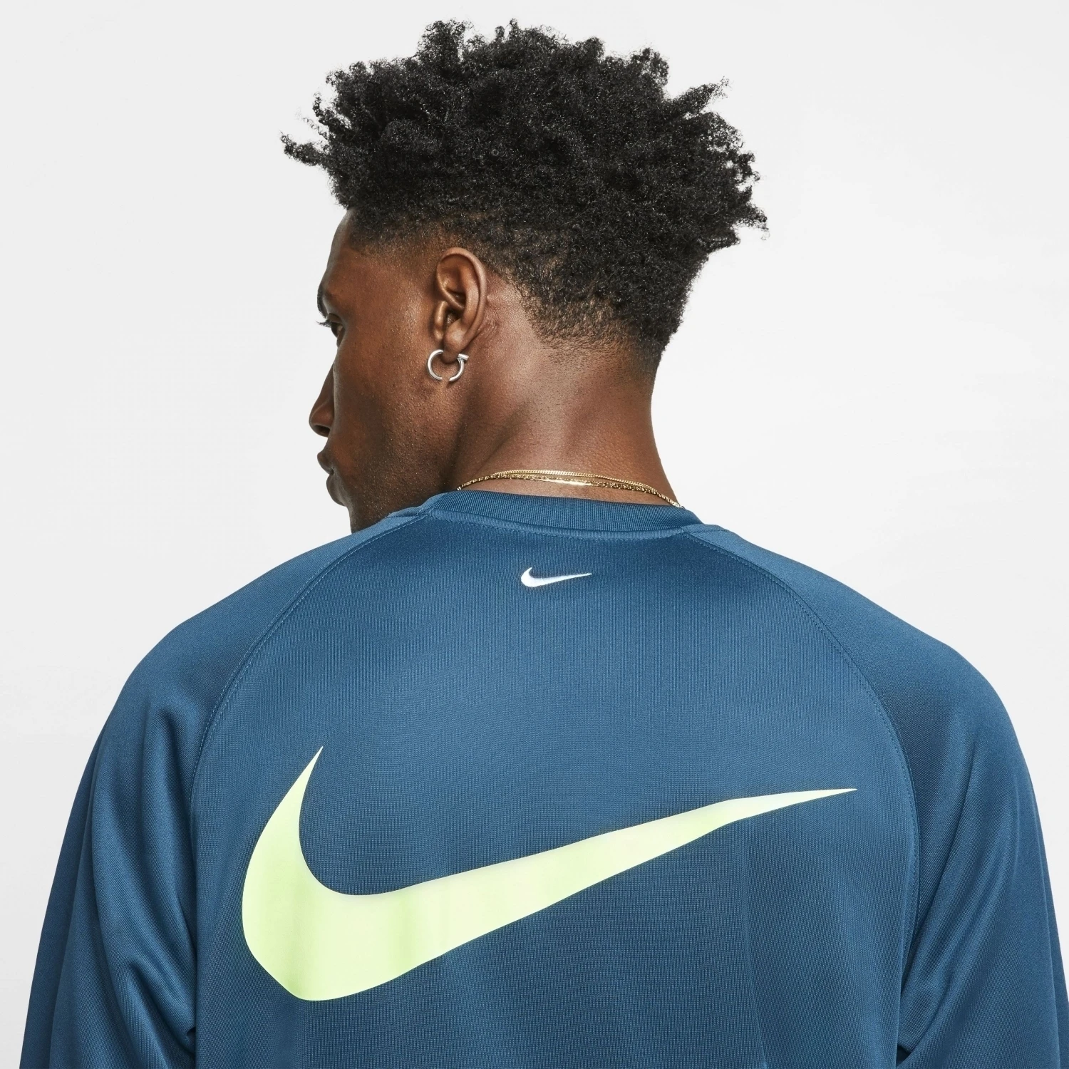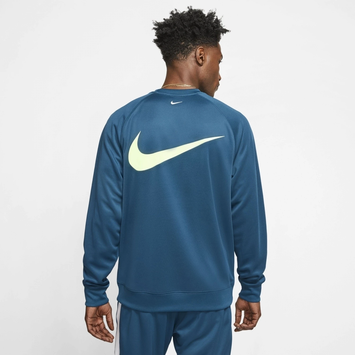 - „SWOOSH“ auf der Brust. Swoosh-Grafiken in der Rückenmitte und auf dem linken Ärmelbündchen. Auf der rechten Brustseite befindet sich eine aufgedruckte doppelte Swoosh-Grafik und hinten auf dem Rücken eine Swoosh-Grafik im Siebdruck.